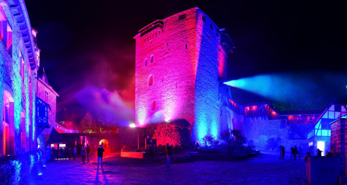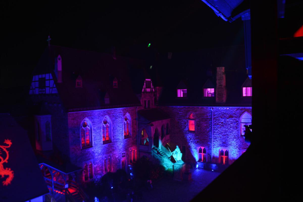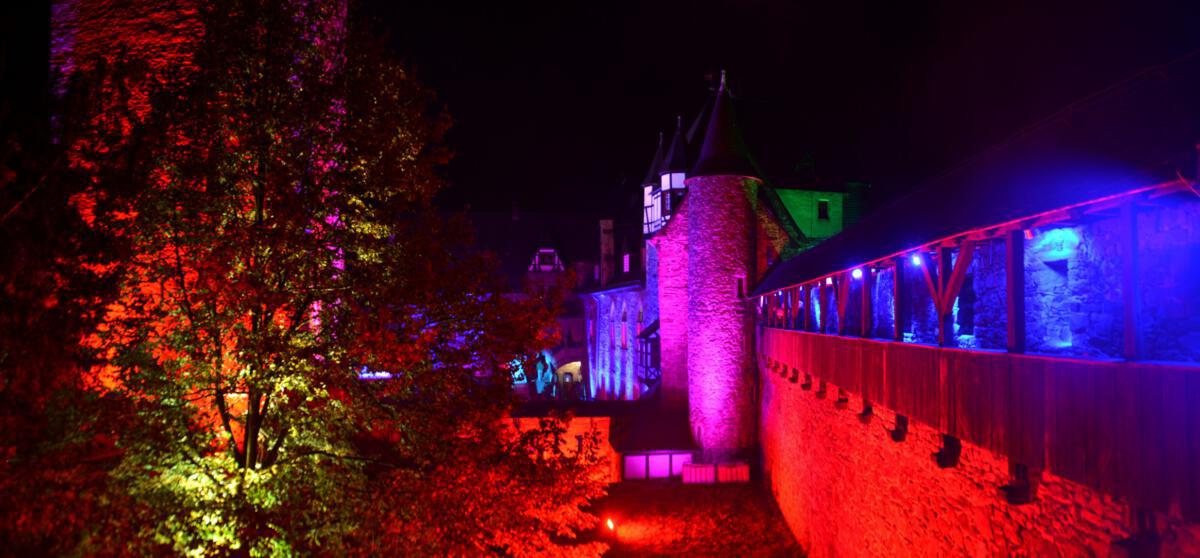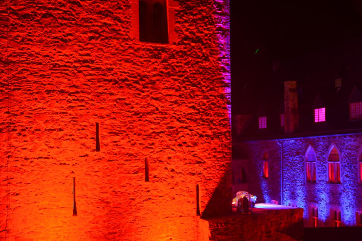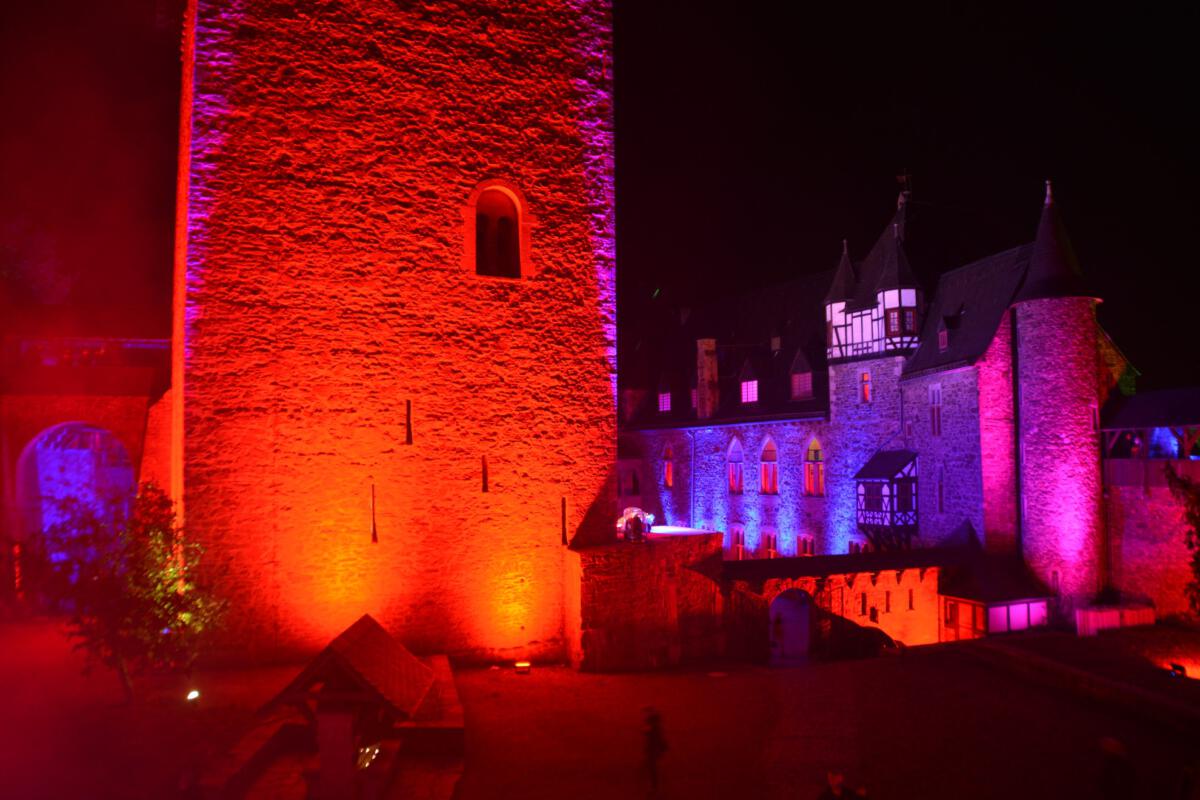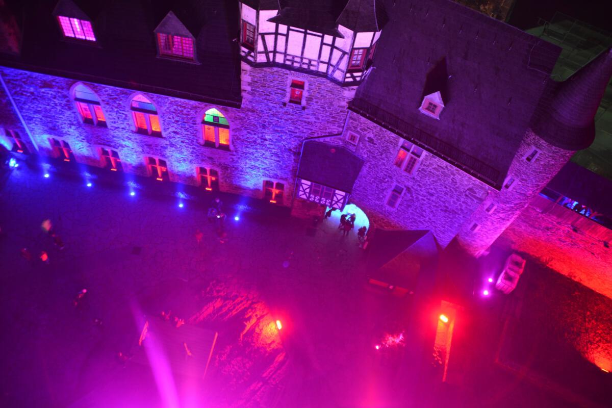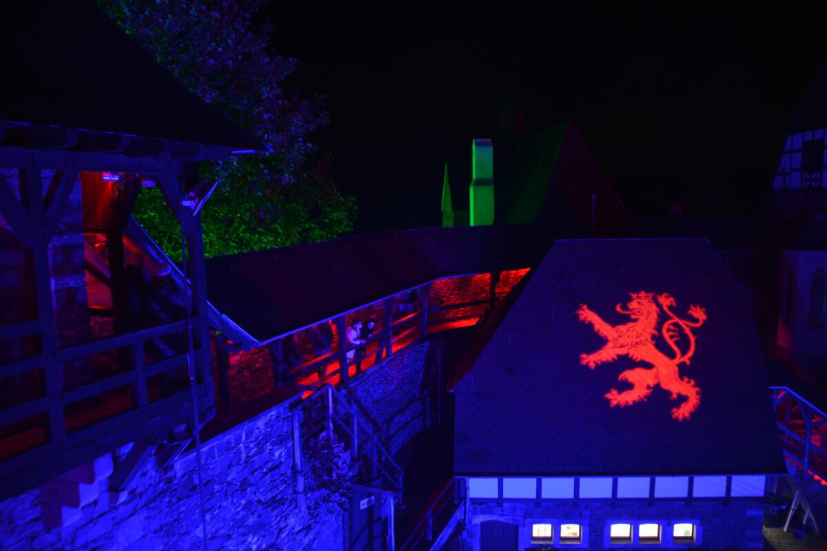 Viele Scheinwerfer und Projektoren erleuchten Schloss Burg innen und außen. Hinzu kommen spezielle Installationen, die den Abend einfach „bunt“ werden lassen.