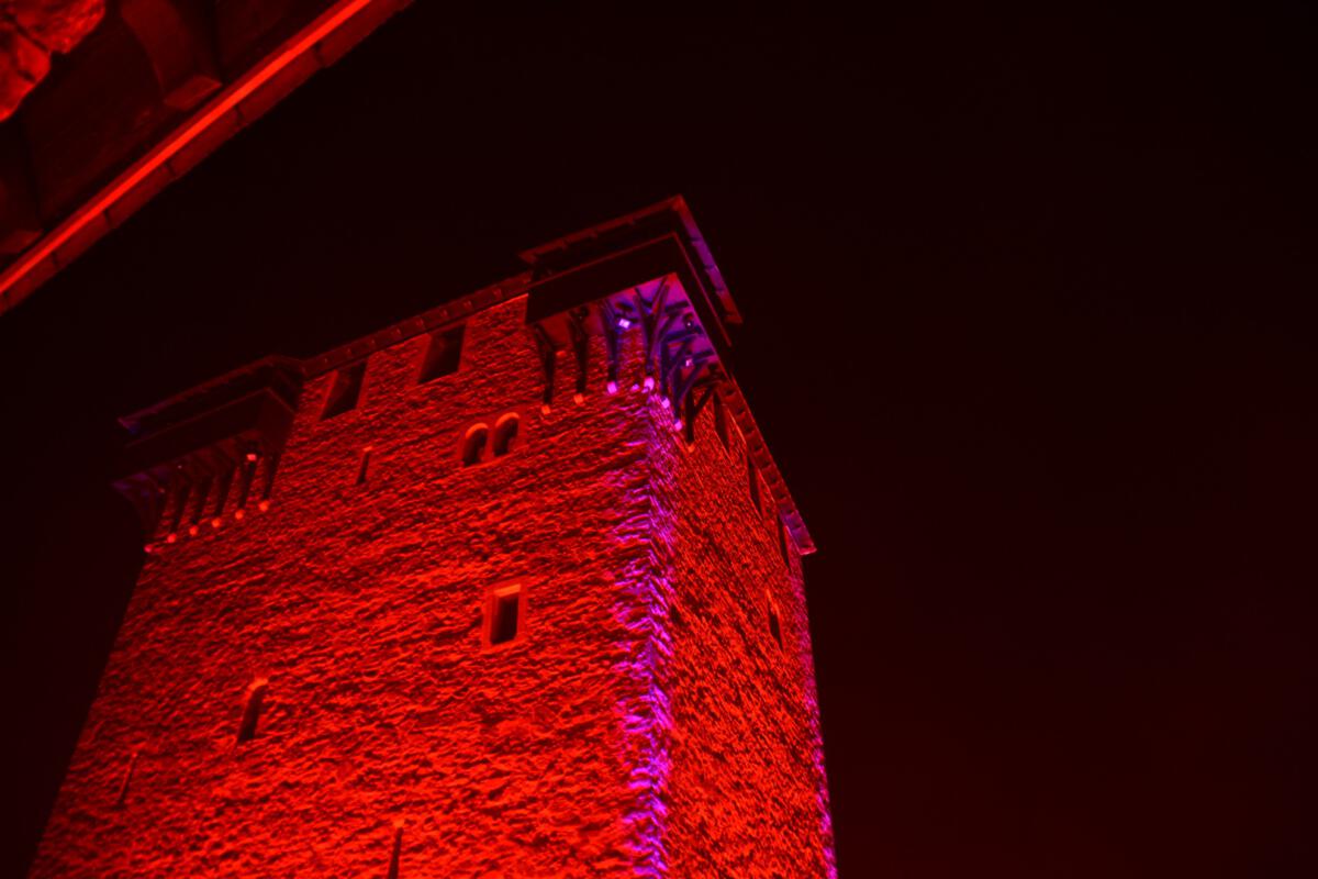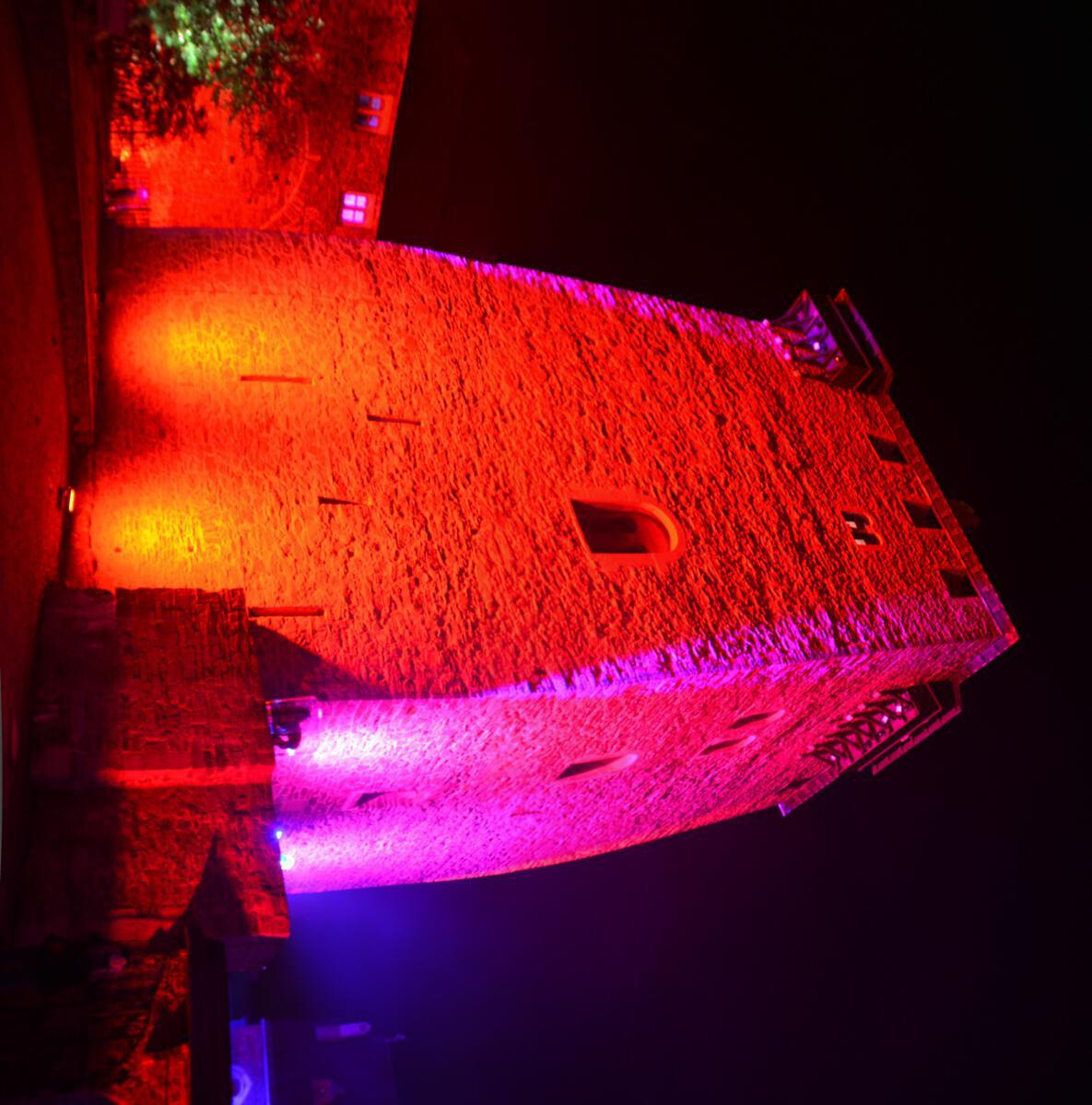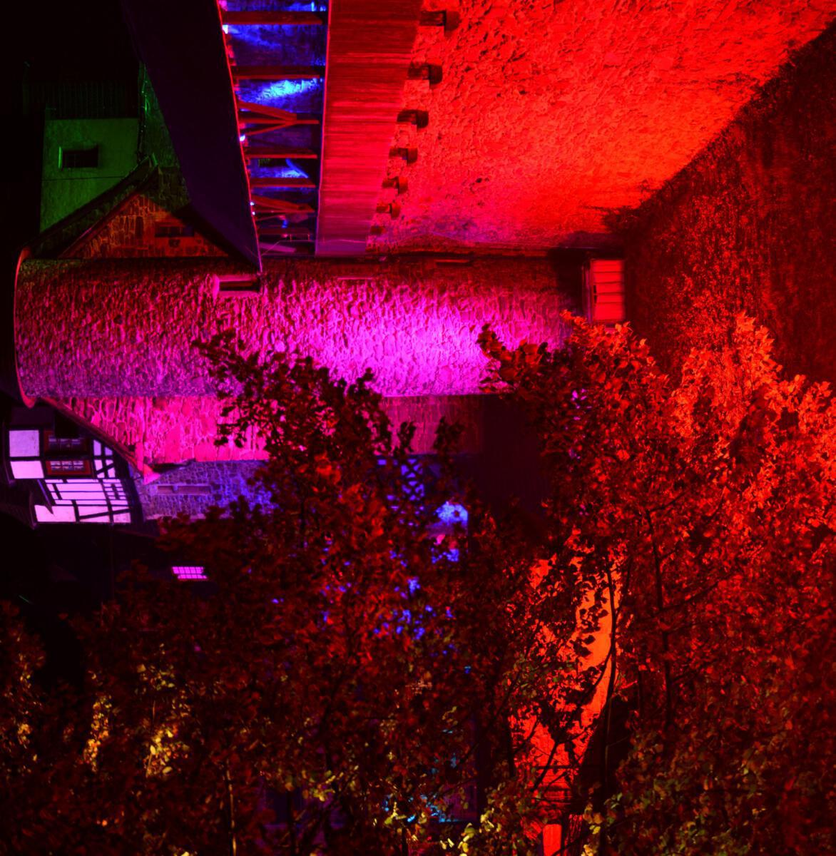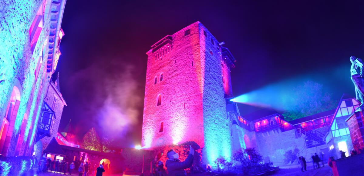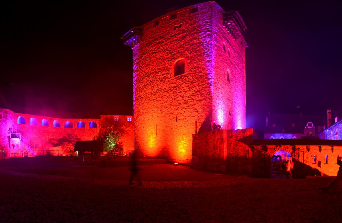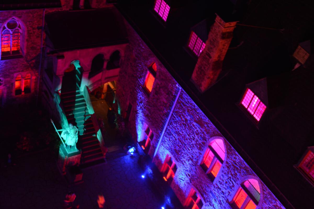 Viele Scheinwerfer und Projektoren erleuchten Schloss Burg innen und außen. Hinzu kommen spezielle Installationen, die den Abend einfach „bunt“ werden lassen.